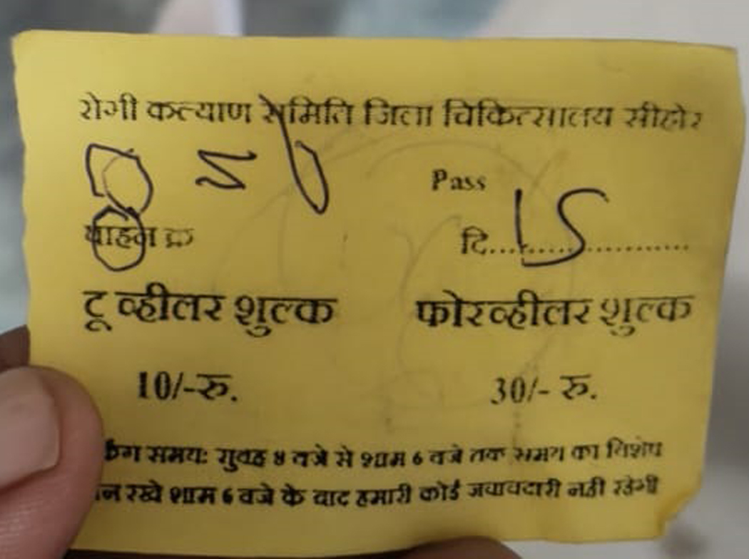 वाहन चालकों को एक पर्ची दी जा रही है, जिस पर रोगी कल्याण समिति जिला चिकित्सालय सीहोर, पास लिखा है। इस पर्ची पर वाहनों की पार्किंग का समय सुबह 8 बजे से शाम 6 बजे तक निर्धारित है। चौंकाने वाली बात यह है कि पर्ची पर साफ लिखा है कि शाम 6 बजे के बाद हमारी कोई जवाबदारी नहीं रहेगी।