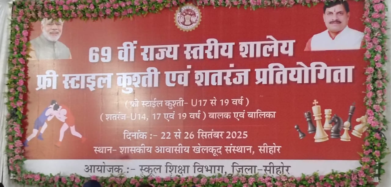 सीहोर। स्कूल शिक्षा विभाग एक अजीबोगरीब वजह से सुर्खियों में है। विभाग ने 22 से 26 सितंबर तक होने वाली 69वीं राज्य स्तरीय शालेय फ्री स्टाइल कुश्ती और शतरंज प्रतियोगिता के लिए जो बैनर लगाया है, उसमें प्रधानमंत्री नरेंद्र मोदी और मुख्यमंत्री डॉ. मोहन यादव के अलावा सीहोर के स्थानीय जनप्रतिनिधियों की तस्वीरें नदारद हैं। इस बैनर ने शहर की राजनीति में नई बहस छेड़ दी है कि क्या शिक्षा विभाग ने जानबूझकर स्थानीय नेताओं को नजरअंदाज किया है।